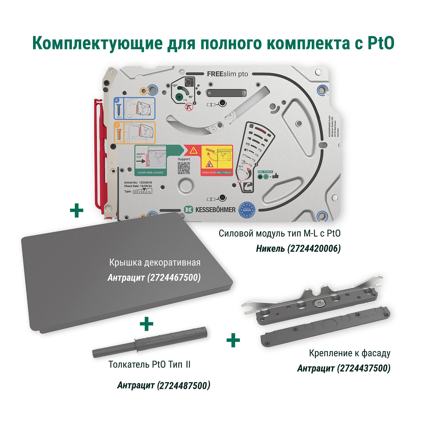 Полный комплект подъемного механизма ФриСлим ФЛАП c толкателем PTO тип II для накладного монтажа, цвет АНТРАЦИТ Kessebohmer | официальный магазин