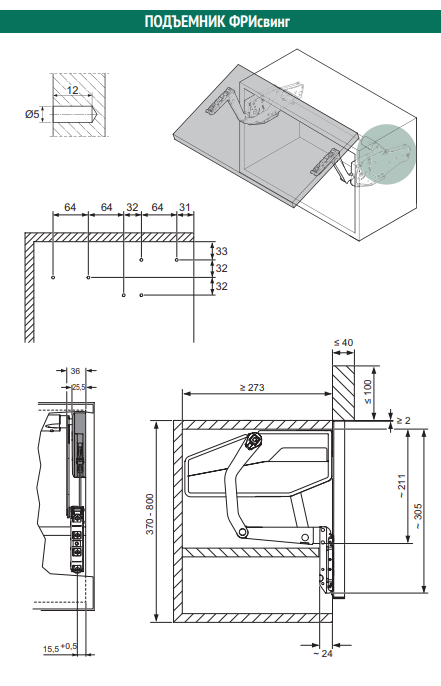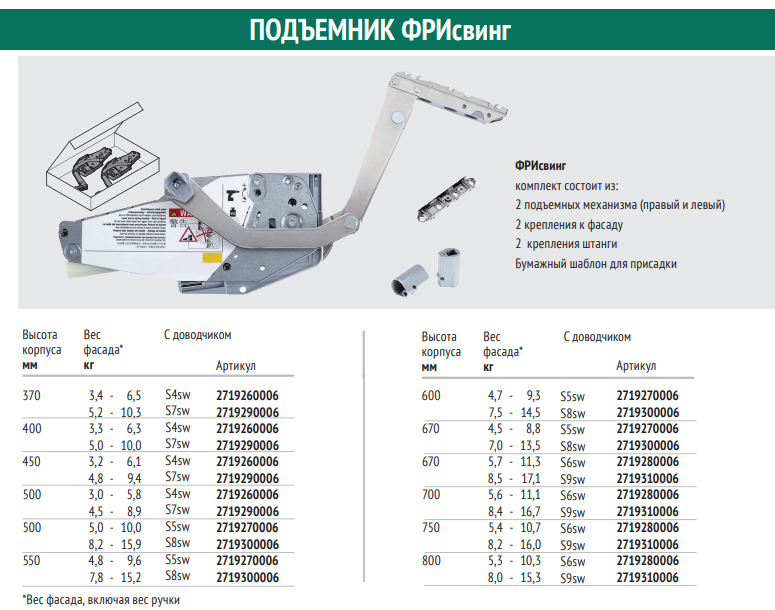 Комплект состоит из 2 подъемных механизмов (правого и левого), 2 креплений к фасаду и 2 крепежных втулок